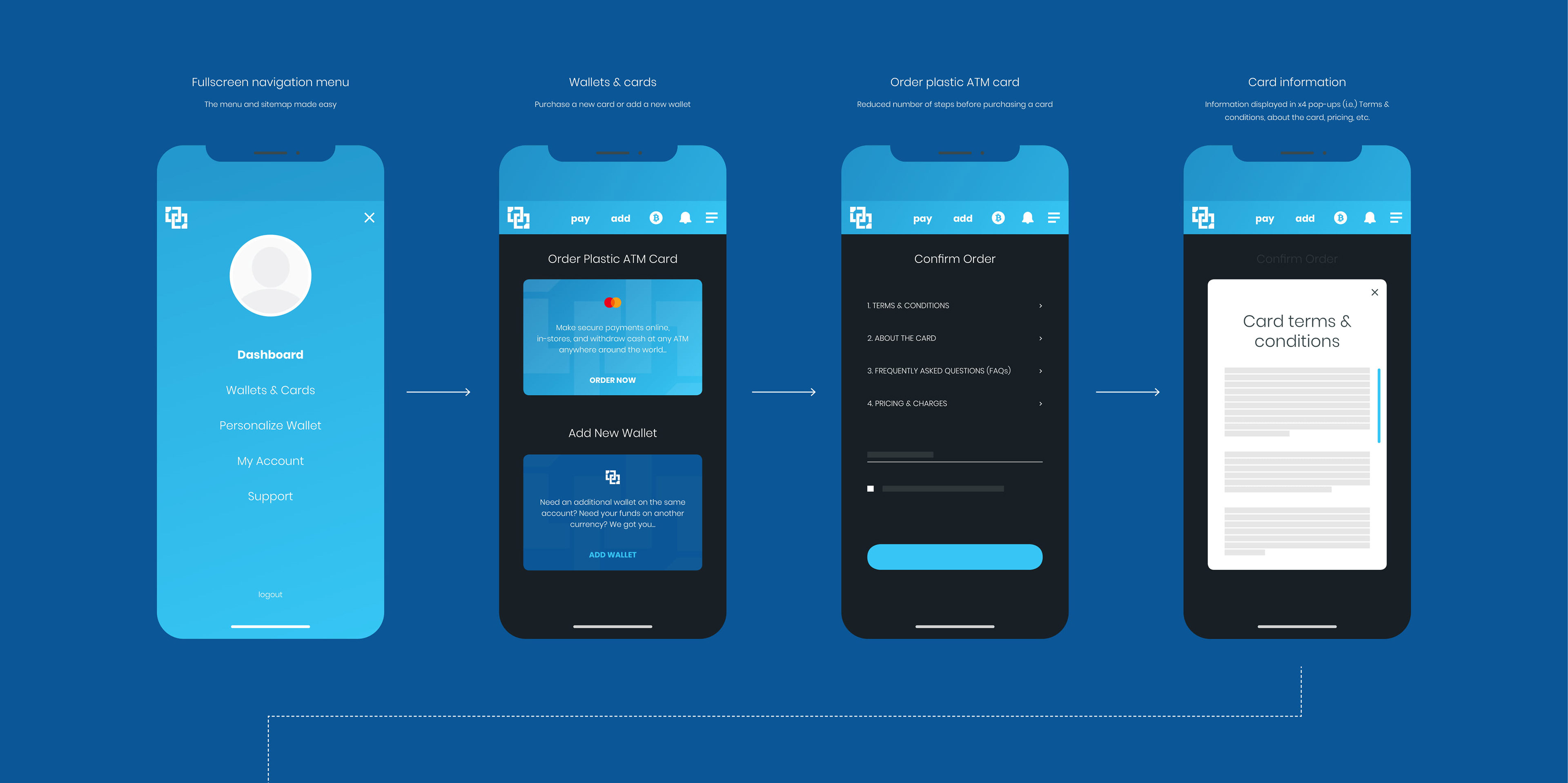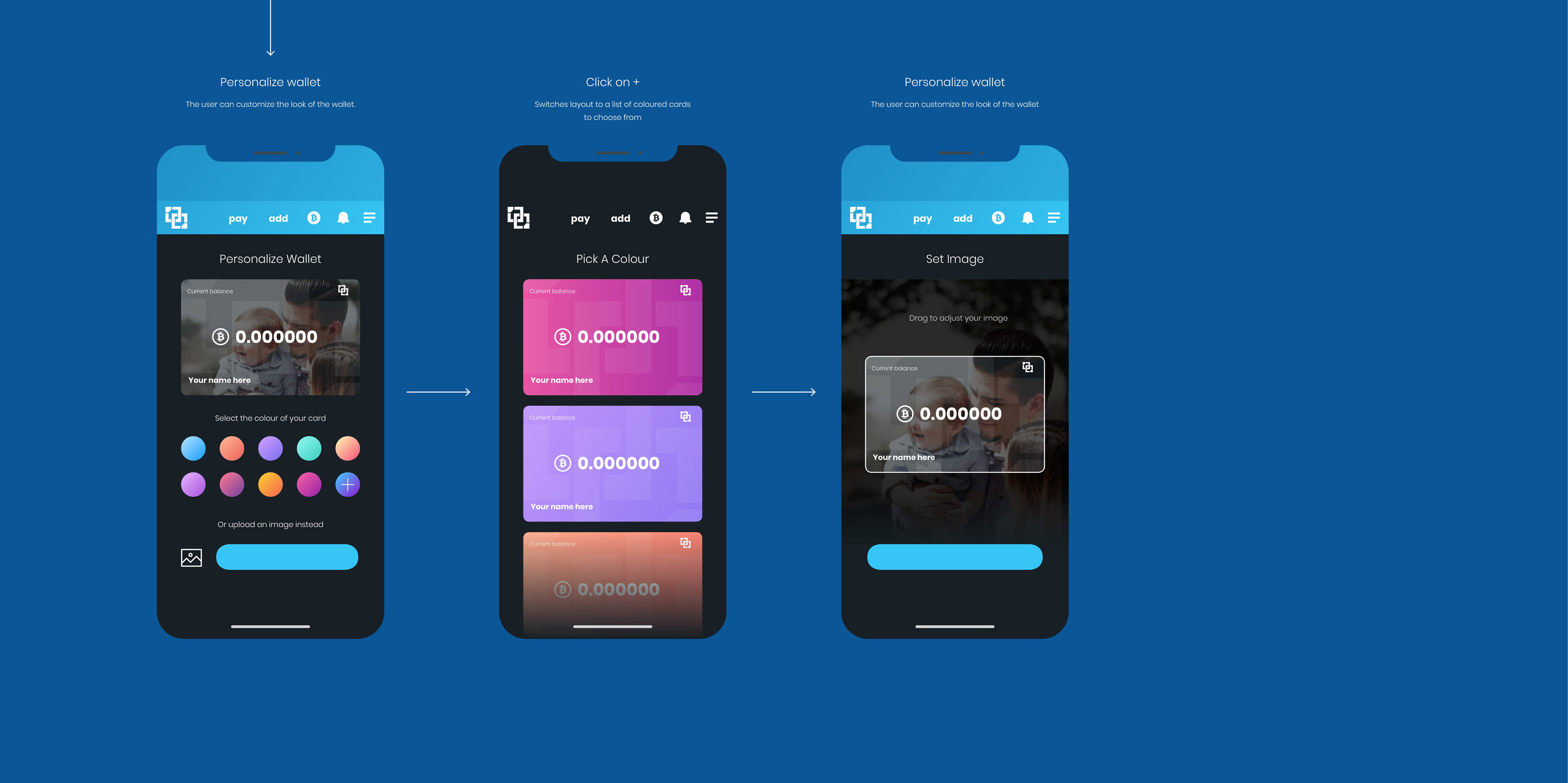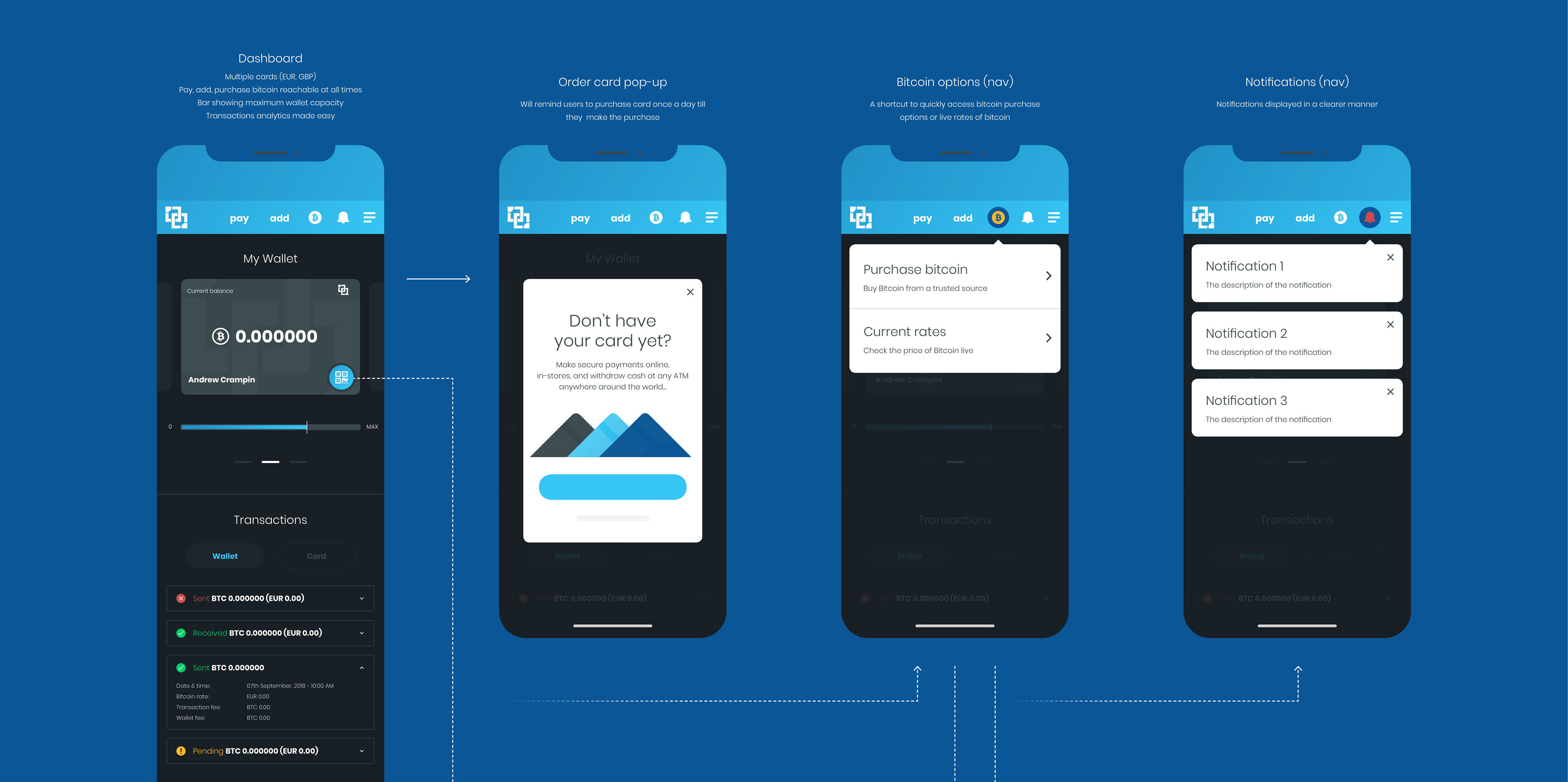 UX/UI, wireframe and design of a concurrency wallet which allows users to spend or withdraw their crypto anywhere, any time.